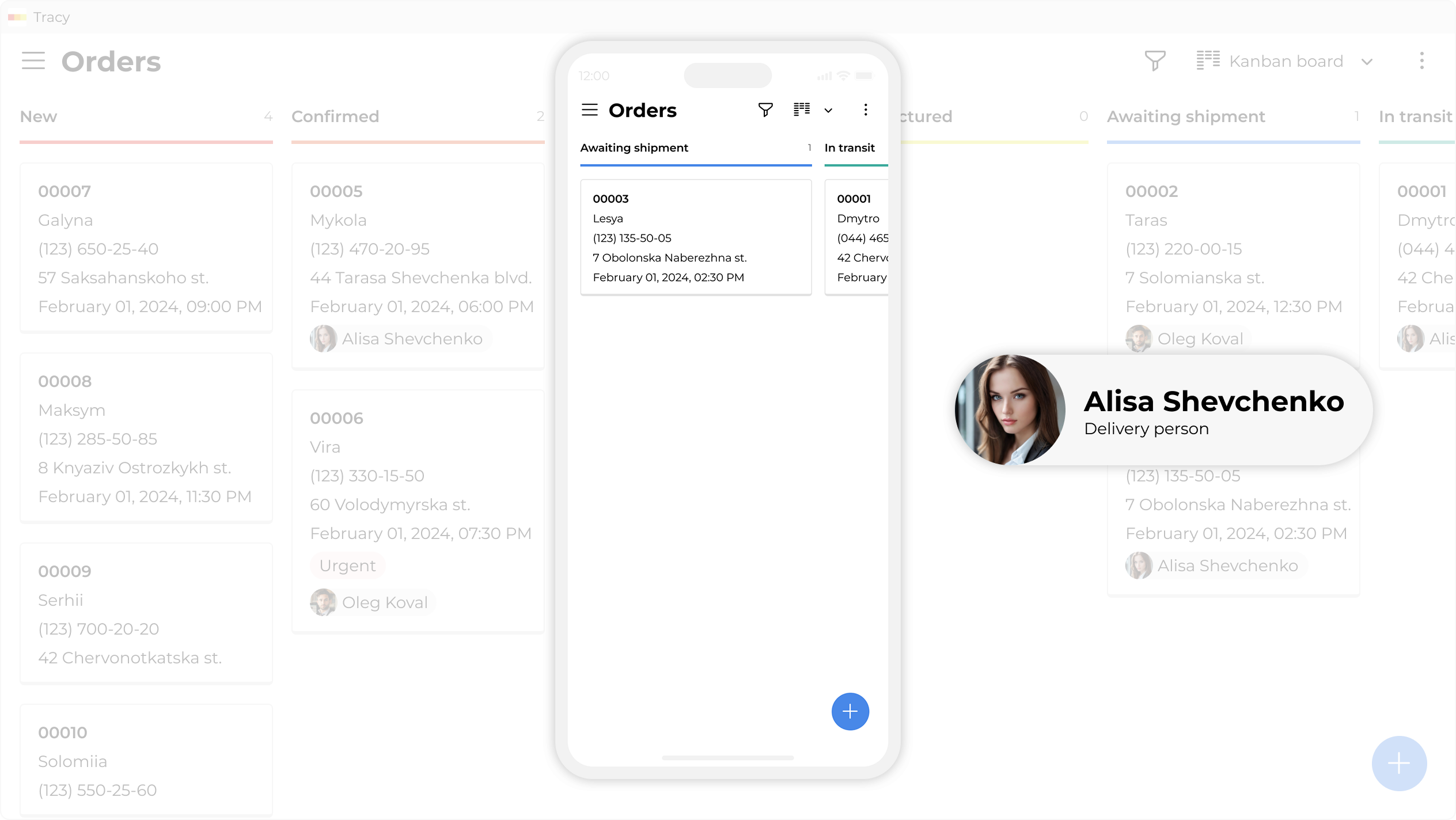 There might be many orders containing various information, but chefs only need to know what and when to prepare (displayed on a Kanban board on a large screen), while couriers need to know what, where, and when to deliver (listed on their phone with notifications).