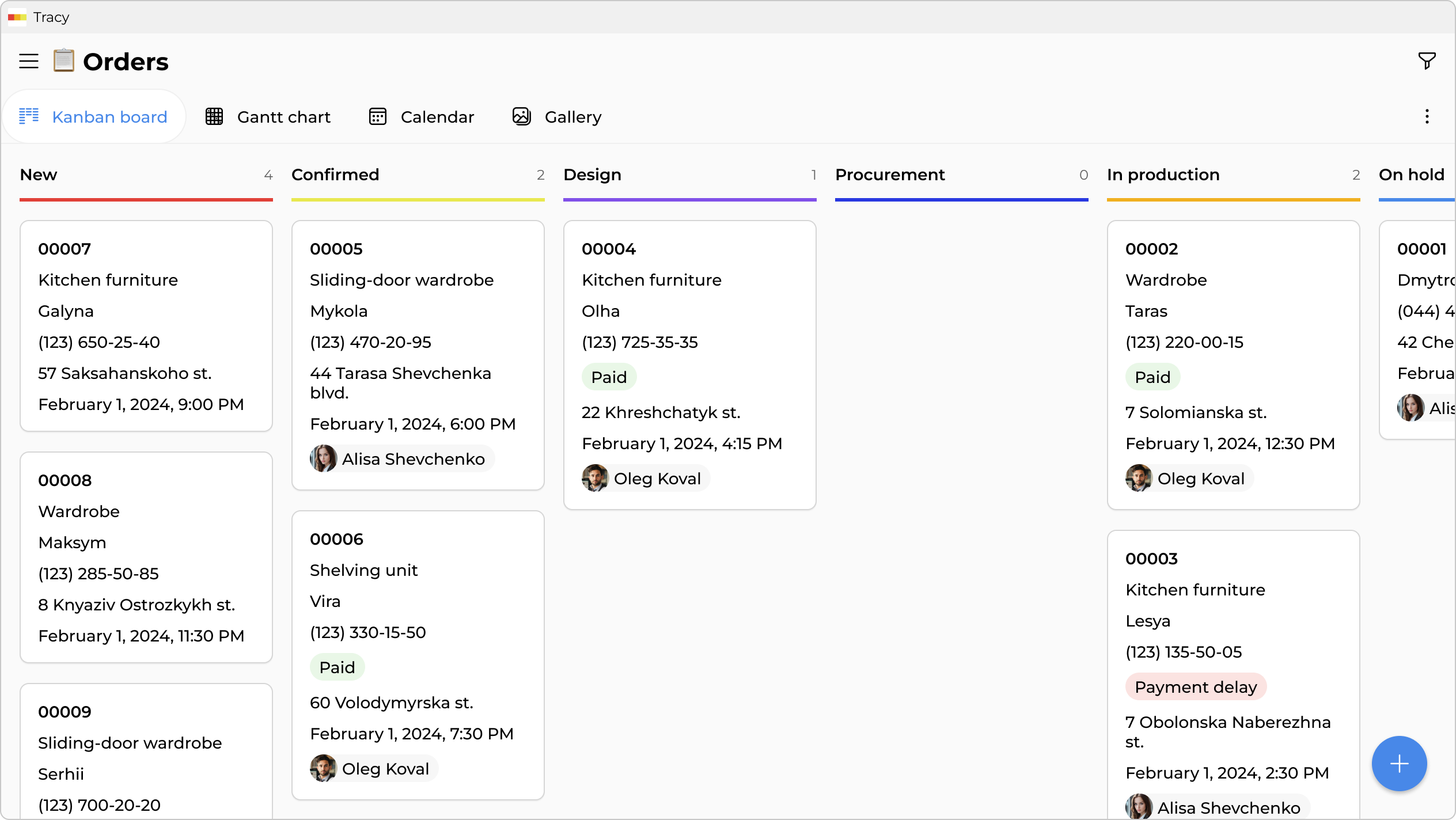 Contracts, invoices, technical tasks, drawings, material purchase orders, and responsible persons for each stage—all inside the card.