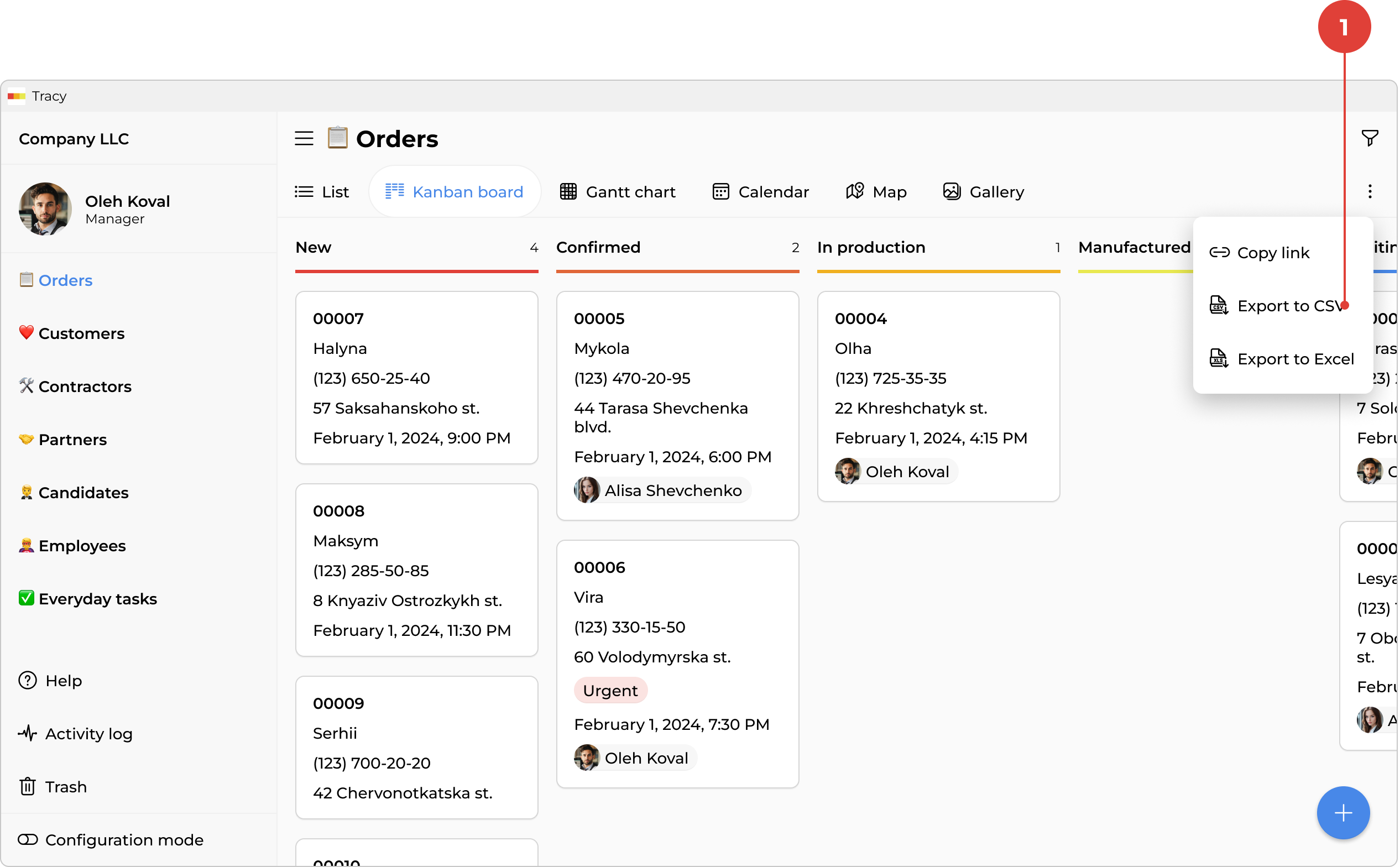 To export records, select the desired dataset in the sidebar catalog, click the three dots at the top of the main area, and select the appropriate menu item ①—export as a CSV file (technically TSV, as fields are separated by tabs) or as an Excel file.