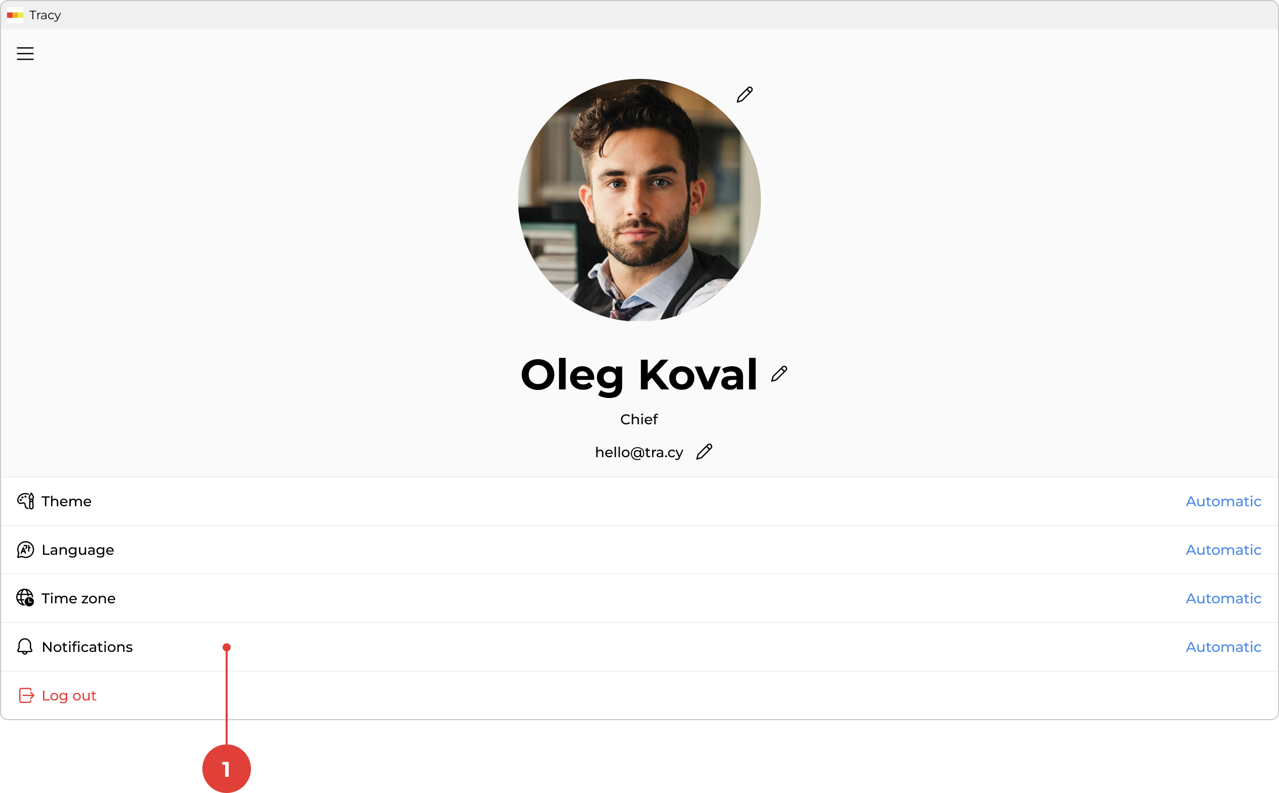To configure notifications, go to the profile screen by clicking on your photo, name, and role in the sidebar, then select “Notifications” ①.