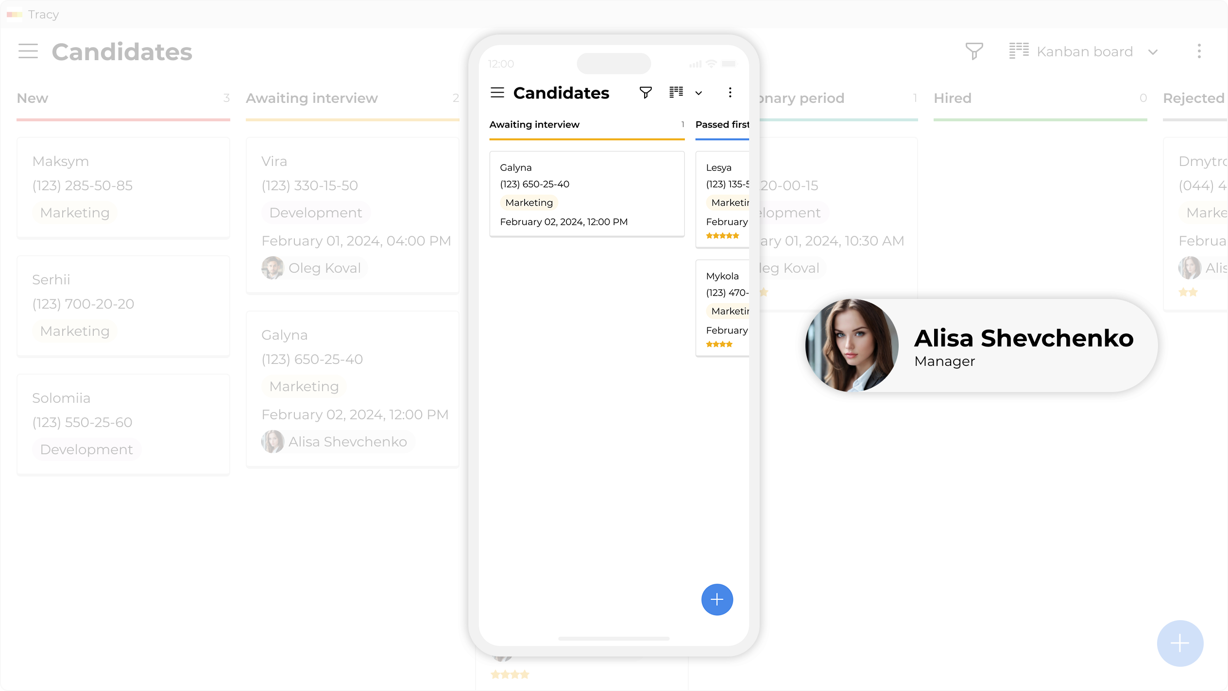 No need to call and ask questions like “How many candidates do we have in total?”, “How many interviews did Alisa conduct last week?”, “Will I have anyone else today?”— all information is available in real-time.