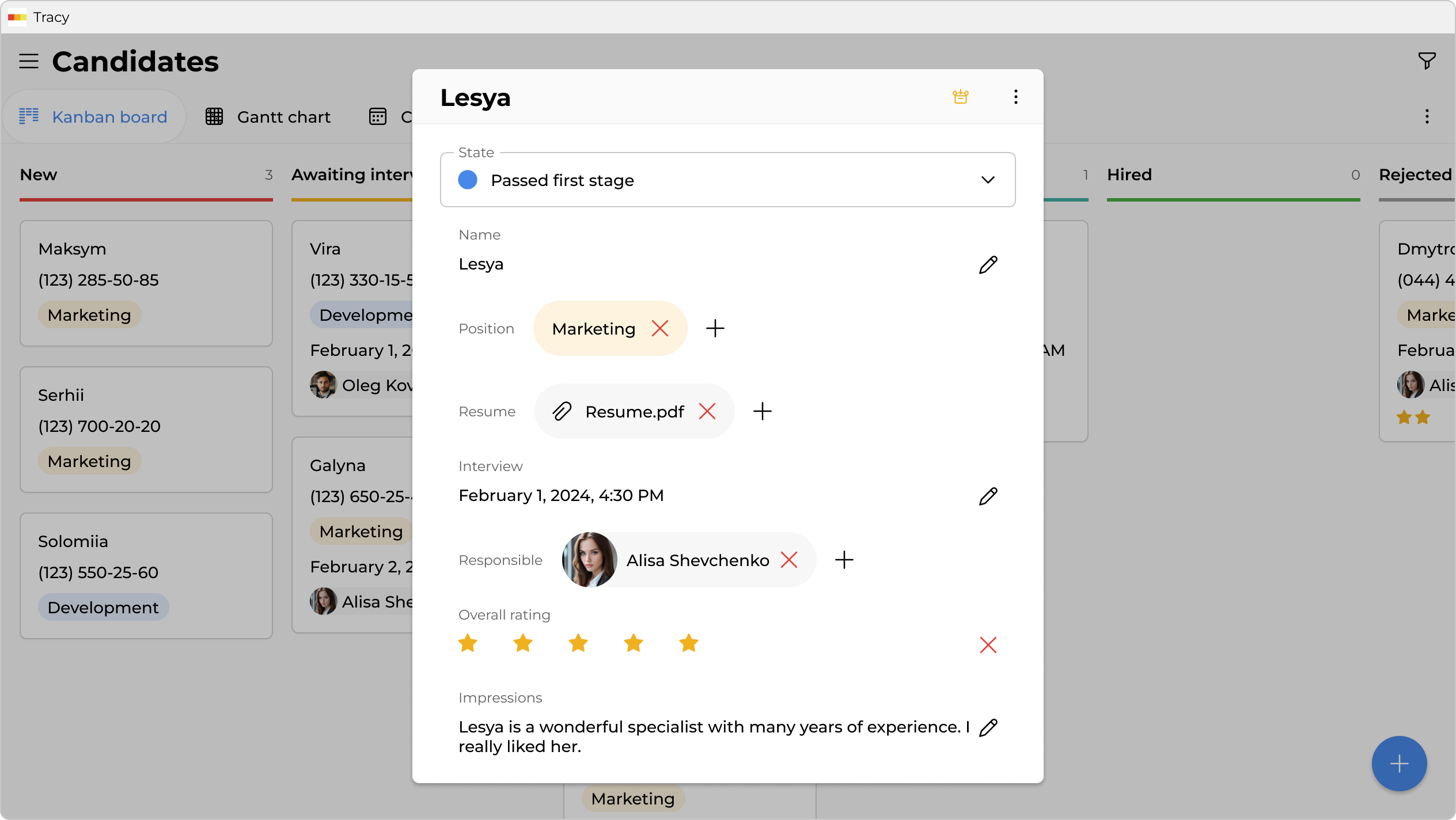 For objectivity, at each stage of the interview, you can choose to hide or display colleagues’ impressions from previous stages. However, for example, the team lead should not see candidates who have not passed the initial interview stages to avoid distractions.