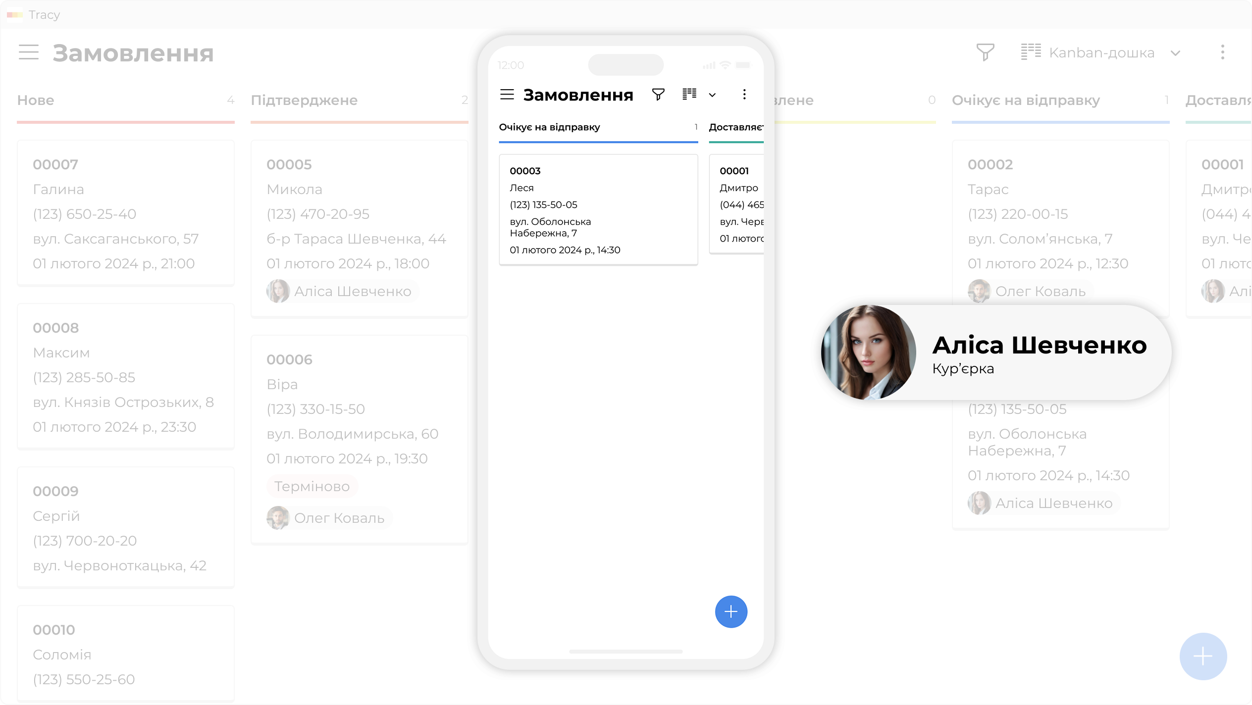 Замовлень може бути багато й вони можуть містити будь-яку інформацію, але кухарям потрібно знати лише що й коли має бути приготованим (Kanban-дошка на великому екрані), а кур’єрам — що, куди й коли потрібно відвести (список у телефоні та сповіщення).