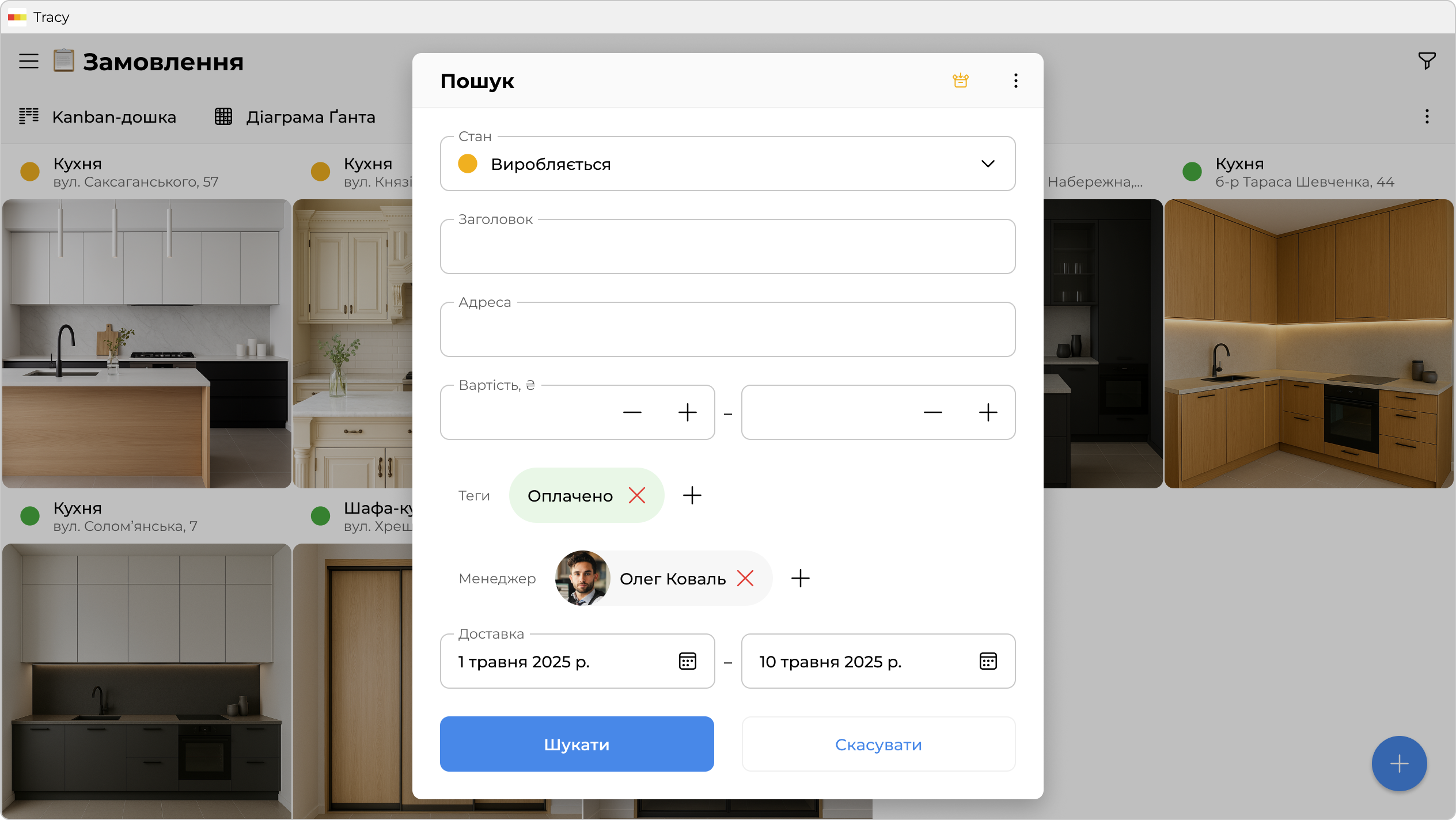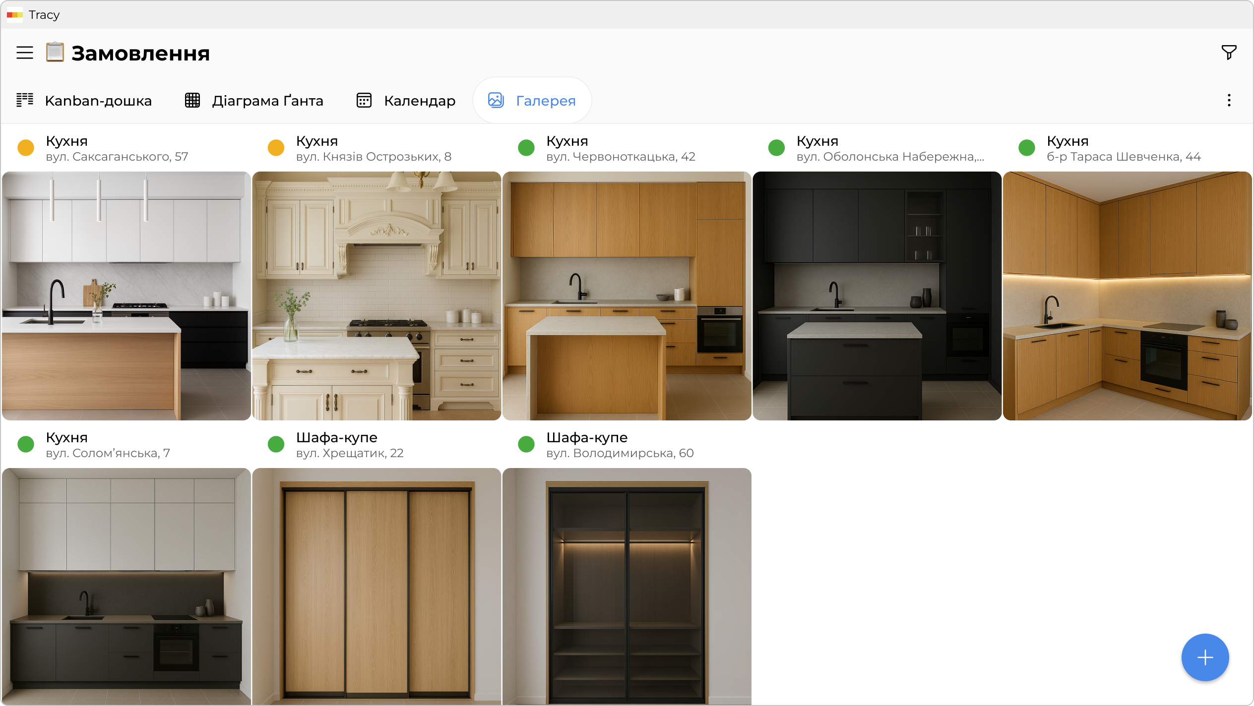 Договори, рахунки, технічні завдання, креслення, інвойси на матеріали, відповідальні за кожен етап — всередині картки.