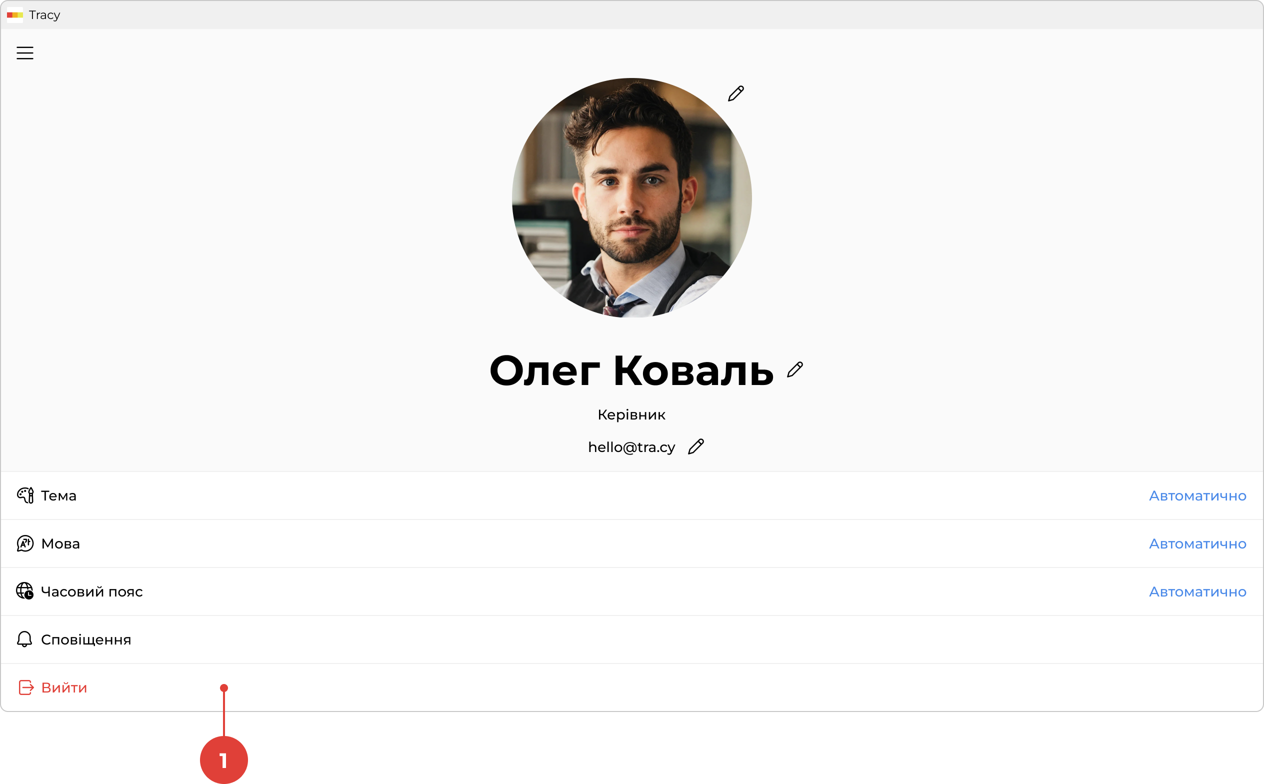 Щоб вийти з облікового запису, перейдіть на екран профілю, натиснувши на свою фотографію, ім’я та роль у бічній панелі, а потім виберіть пункт «Вийти» внизу екрану ①.