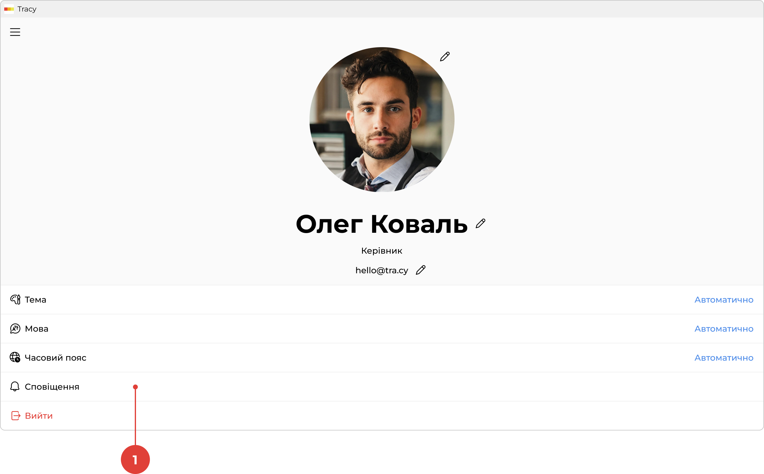 Щоб налаштувати сповіщення, перейдіть на екран профілю, натиснувши на свою фотографію, ім’я та роль у бічній панелі, а потім виберіть пункт «Сповіщення» ①.