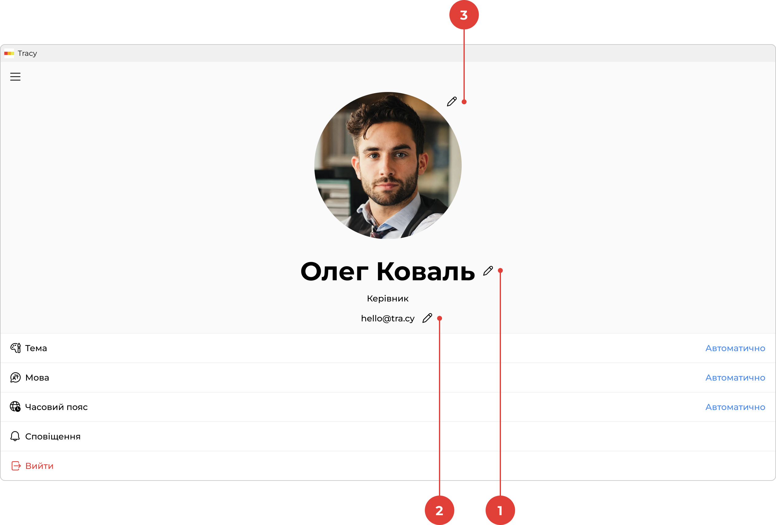 Для зміни особистих даних необхідно перейти на екран профілю, натиснувши на свою фотографію, ім’я та роль у бічній панелі.