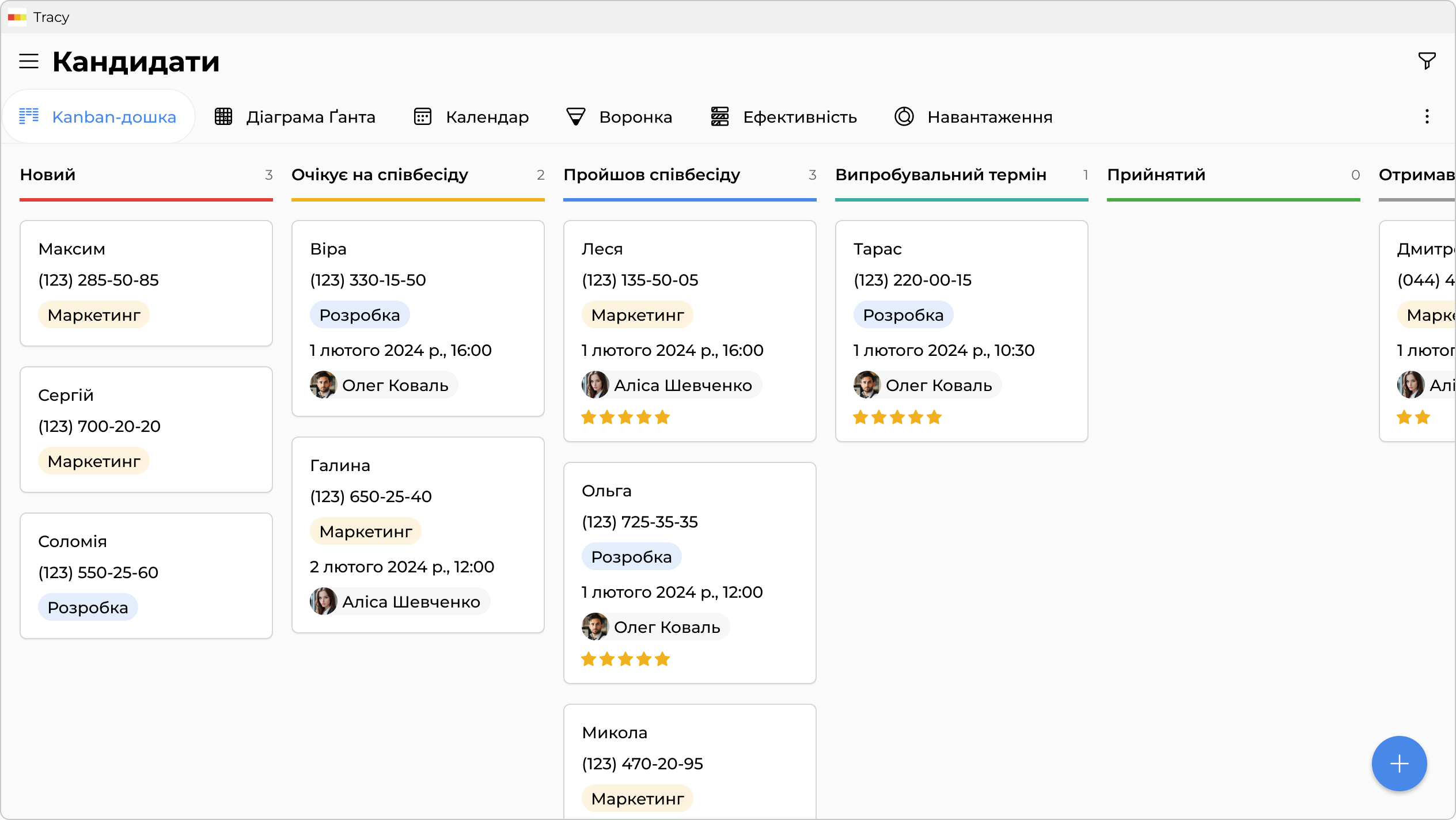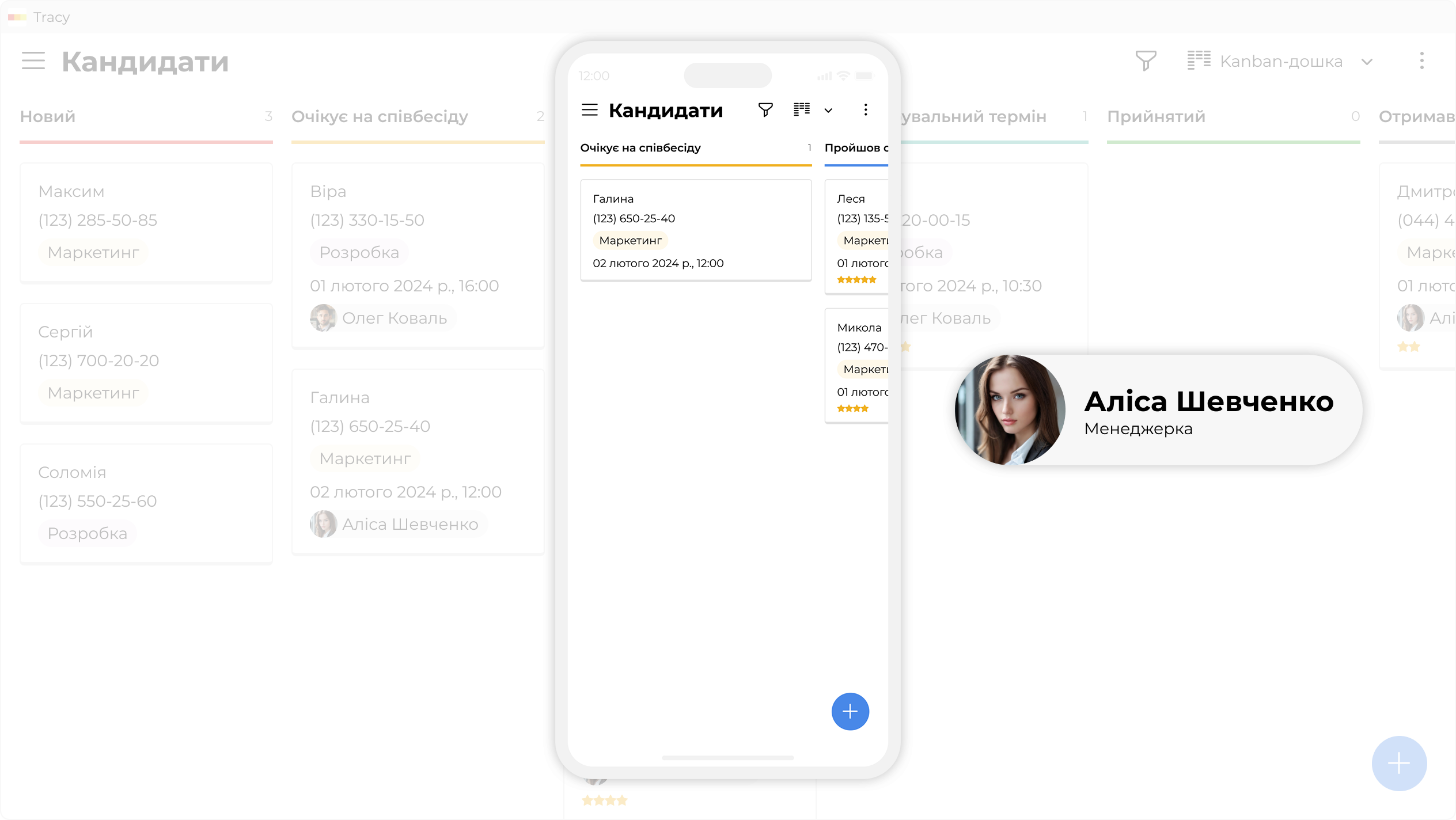 «Скільки всього кандидатів ми маємо?», «Скільки співбесід провела Аліса минулого тижня?», «Чи буде в мене сьогодні ще хтось?» — не потрібно дзвонити й запитувати, вся інформація доступна в реальному часі.
